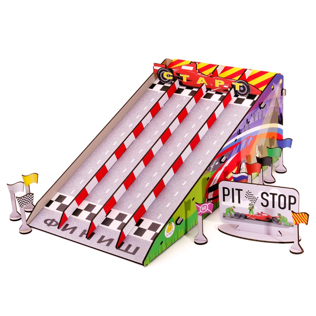 В набор входят: 1 знак - стоянка на подставке, 10 флажков на подставке, 4 стороны трека для сборки (скат, две боковые, задняя), 3 разделительные полосы, 1 ограничитель старта, заглушки-фиксаторы.